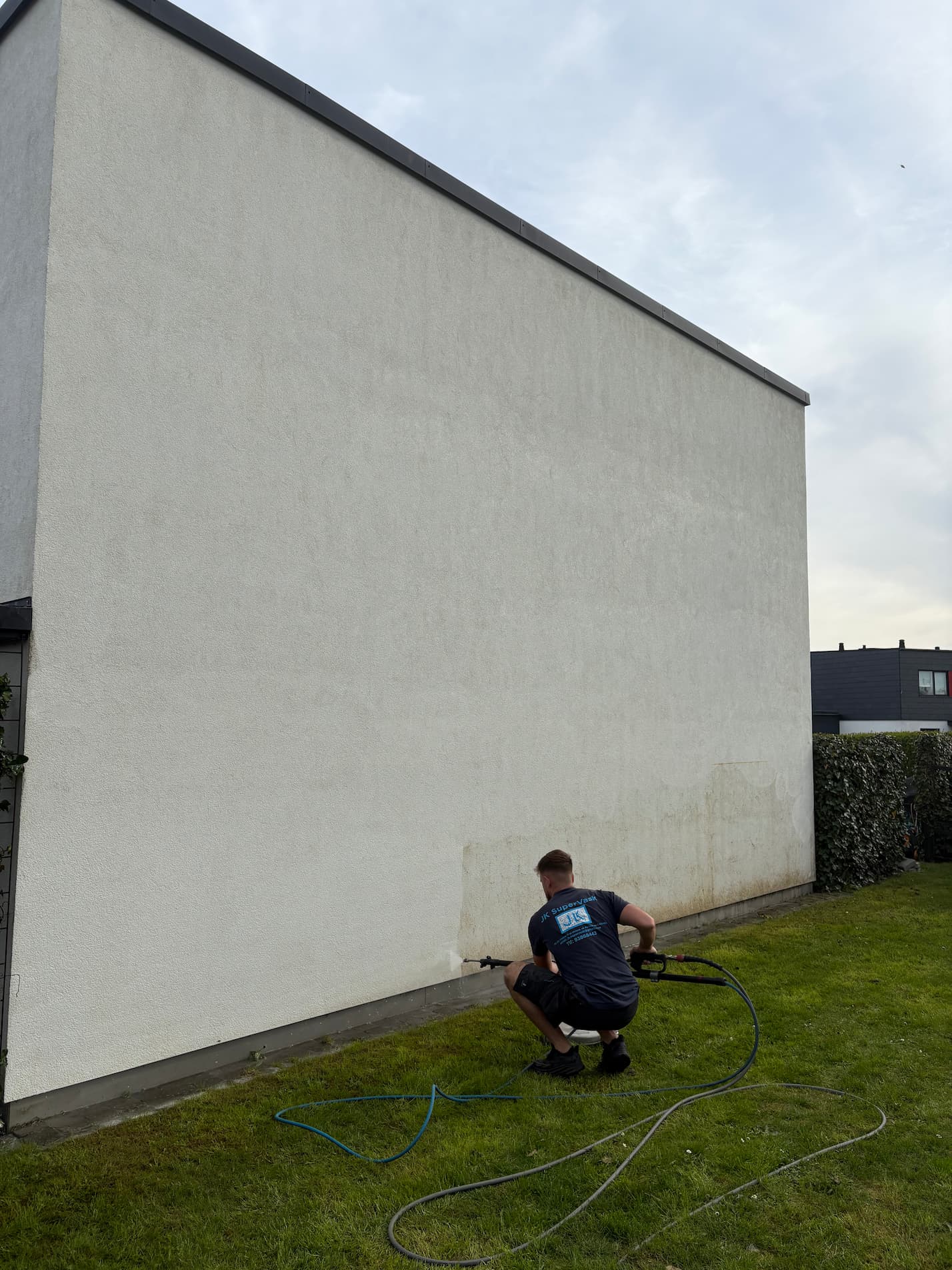 Vi kobler os typisk på din udendørs vandhane (eller indendørs efter aftale), og du vil med det samme kunne se din facade transformere sig og fremstå som ny."